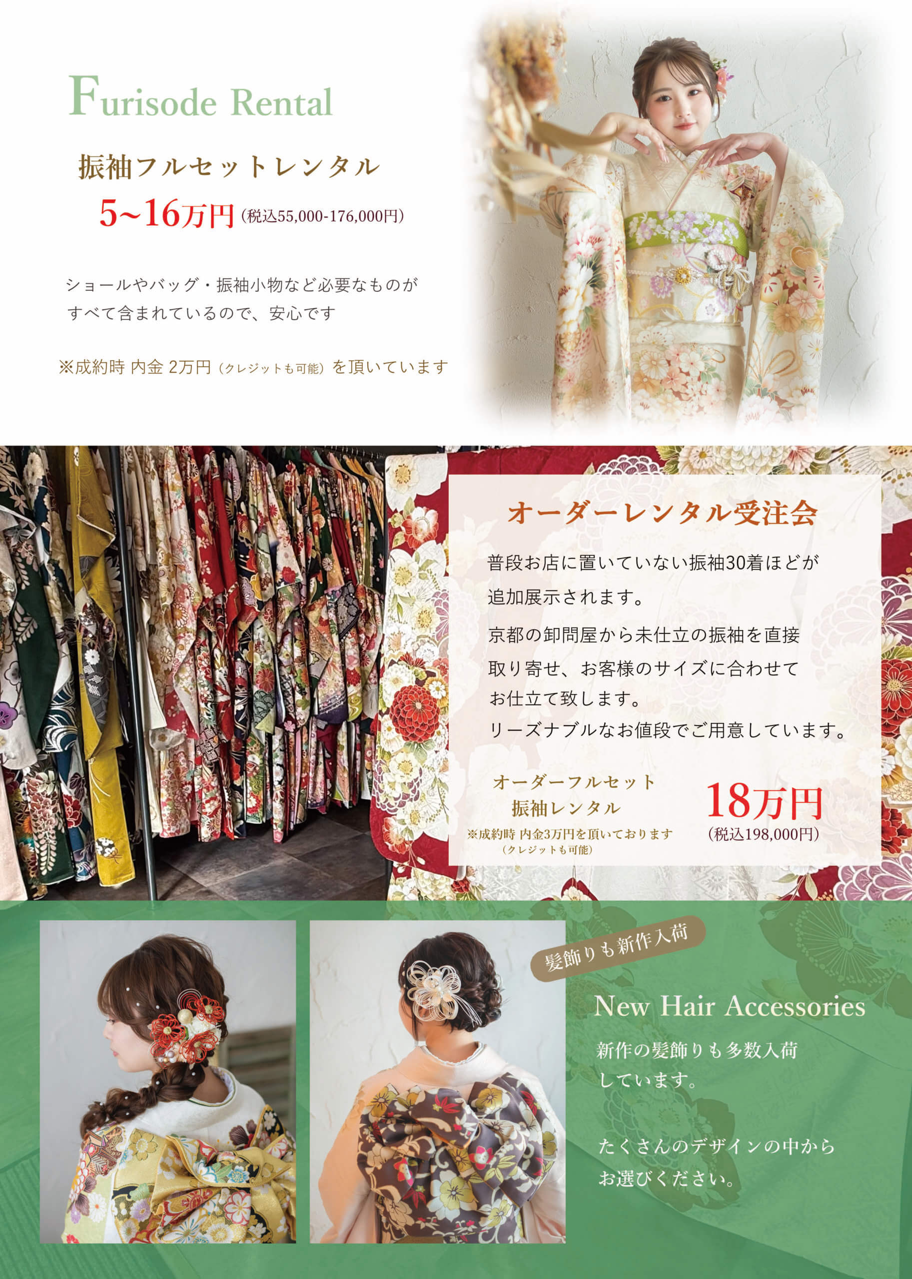 今回の展示会限定で、普段お店に置いていない振袖が30着ほど追加展示されます。京都の卸問屋から未仕立の振袖を直接取り寄せ、お客様のサイズに合わせてお仕立て致します。リーズナブルなお値段でご用意していますので、ぜひこの機会をご利用下さい。